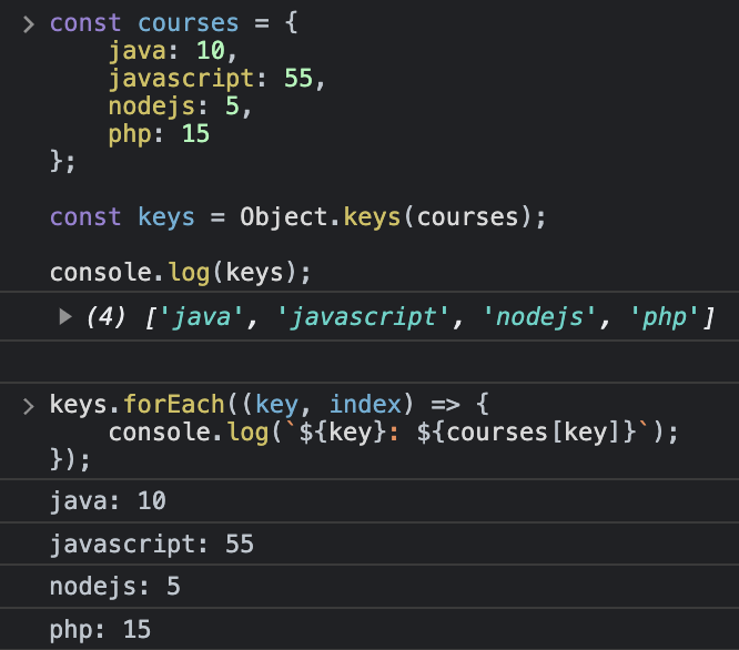 Object.values() 메소드는 ES8에서 도입되었으며, Object.key()와 반대로 작동합니다. 이는 객체의 모든 속성 값을 배열로 리턴합니다. 그 다음 배열 루프문으로 값들에 대해 루프돌 수 있습니다.